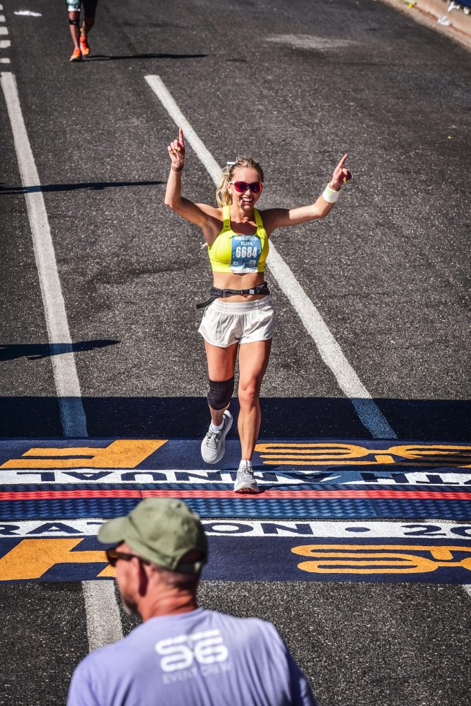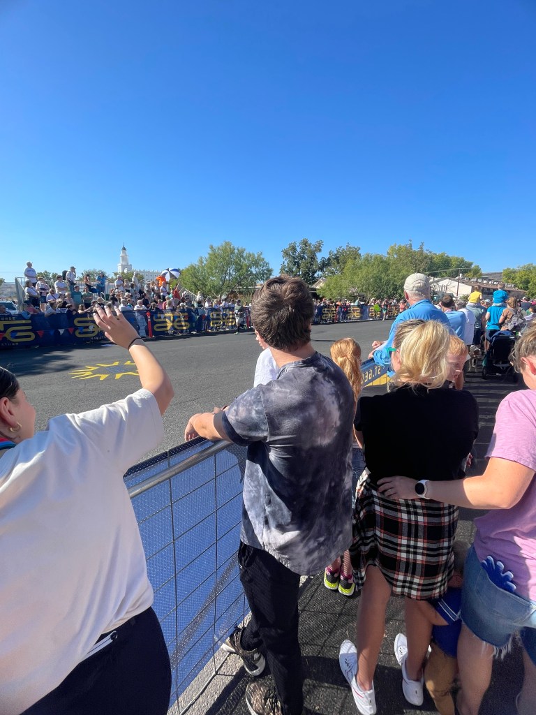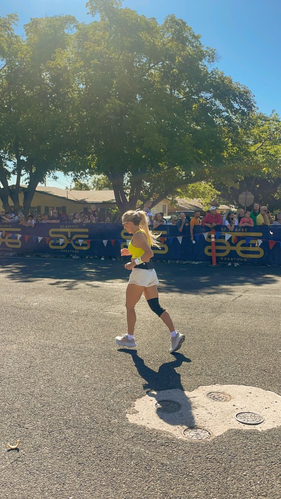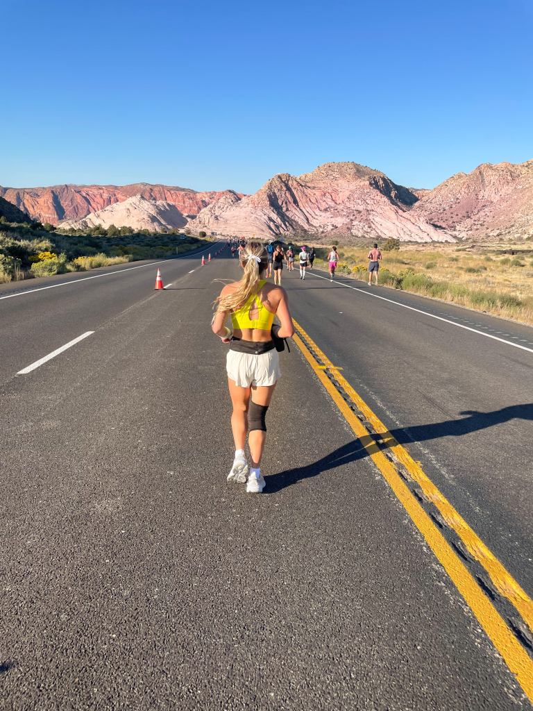There were aid stations every 2 miles, and I made sure to drink Gatorade at each one to keep my electrolytes in check. I was carrying a water bottle and sipped that throughout the whole race as well, which helped me feel refreshed throughout the race. I took a non-caffeinated gel at mile 6, and cruised. I took a caffeinated gel at mile 12, and I was flying. By mile 13, one of my blisters had popped and my quads were starting to ache. I called my family to ask them to bring me some band aids and slip-on shoes to wear after the race. I was in pain, but the view at this point of the race was my favorite. St. George is stunning. The nature, red rock, and perfect weather made for the ideal environment. It was at this moment that I ran into my coworker on the course, too! We enjoyed the scenery together, then he took off.